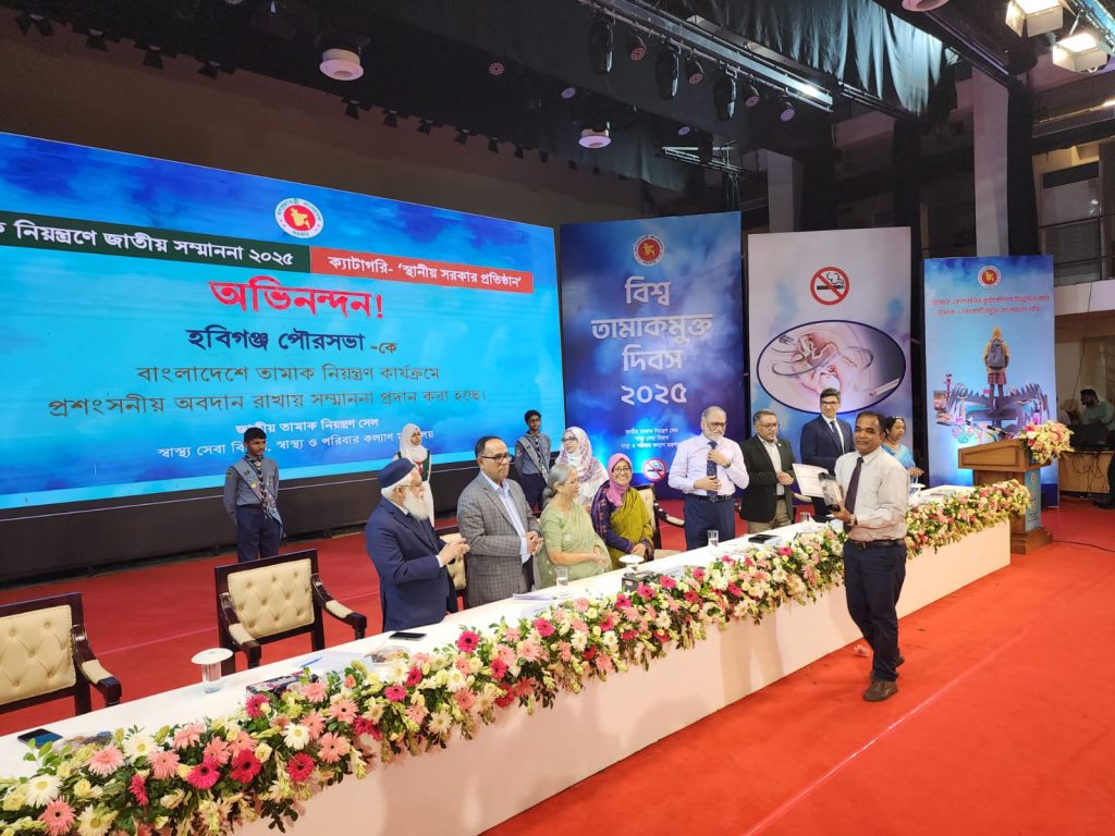 তামাক ও তামাকজাত দ্রব্যের ব্যবহার কমানোর জন্য স্থানীয় সরকার বিভাগের তামাক নিয়ন্ত্রণ গাইডলাইন বাস্তবায়নে বিভিন্ন কার্যক্রম গ্রহনের জন্য বিশেষ অবদান রাখায় সারা দেশের সকল স্থানীয় সরকার প্রতিষ্ঠানগুলোর মধ্যে হবিগঞ্জ পৌরসভার কার্যক্রম সেরা বিবেচিত হওয়ায় স্বাস্থ্য মন্ত্রনালয়ের জাতীয় তামাক নিয়ন্ত্রন সেল কর্তৃক হবিগঞ্জ পৌলসভাকে বিশেষ সম্মাননা প্রদান করা হয়েছে। ৩১ মে ২০২৫ খ্রি, তারিখে ঢাকার ওসমানী স্মৃতি মিলনায়তনে জাতীয় তামাক নিয়ন্ত্রন দিবস উপলক্ষে এক আলোচনা সভা শেষে স্বাস্থ্য মন্ত্রনালয়ের উপদেষ্টা নুরজাহান বেগম প্রধান অতিথি হিসেবে আনুষ্ঠানিকভাবে সম্মাননা পত্র ও ক্রেষ্ট তুলে দেন হবিগঞ্জ পৌরসভার পৌর নির্বাহী কর্মকর্তা ও হবিগঞ্জ পৌরসভার তামাক নিয়ন্ত্রন কার্যক্রমের ফোকালপার্সন মো: জাবেদ ইকবাল চৌধূরীর নিকট। উক্ত অনুষ্ঠানে মোট ৯ টি ক্যাটাগরিতে তামাক নিয়ন্ত্রনে বিশেষ অবদান রাখায় বিভিন্ন ব্যক্তি ও প্রতিষ্ঠানকে সম্মাননা প্রদান করা হয়। স্থানীয় সরকার প্রতিষ্টানের তামাক নিয়ন্ত্রণ কার্যক্রম মূল্যায়নে হবিগঞ্জ পৌরসভা এ সম্মাননা লাভ করে। এ অনুষ্ঠানে বিশেষ অতিথি হিসেবে উপস্থিত ছিলেন স্বাস্থ্য মন্ত্রনালয়ের বিশেষ সহকারী (প্রতিমন্ত্রী) ডা. মো: সায়েদুর রহমান, মৎস্য ও প্রানিসম্পদ উপদেষ্ঠা ফরিদা আখতার, বিভিন্ন মন্ত্রনালয়ের সচিবগন, বিশ^ স্বাস্থ্যসংস্থার প্রতিনিধি এবং বিভিন্ন সরকারী বেসরকারী প্রতিষ্ঠানের প্রতিনিধিগন। হবিগঞ্জ পৌরসভার তামাক নিয়ন্ত্রনের উল্লেখযোগ্য কাজগুলো ছিল পৌরসভার লাইসেন্সকৃত প্রতিটি টমটমের গায়ে তামাক বিরোধী স্লোগান প্রচার, টমটম চালকদের ধূমপান না করার শপথ করানো, পৌরকর, পানির বিল, ট্রেড লাইসেন্সের কপিতে তামাক বিরোধী স্লোগান প্রচার, বিভিন্ন শিক্ষা প্রতিষ্ঠানে তামাক বিরোধী পোষ্টার, ব্যনার, লিফলেট বিতরন, শিশুদের মাঝে তামাক বিরোধী মনোভাব তৈরীর জন্য চিত্রাংকন প্রতিযোগিতার আয়োজন, পথশিশুদের ধুমপান ও তামাকের হাত থেকে রক্ষা করতে বিনোদন ও প্রনোদনামূলক কার্যক্রম গ্রহন। মূলত: হবিগঞ্জ পৌরসভার তামাক বিরোধী এ সকল কার্যক্রম সমস্বয় ও বাস্তবায়নে অগ্রনী ভূমিকা পালন করেন হবিগঞ্জ পৌরসভার পৌর নির্বাহী কর্মকর্তা ও হবিগঞ্জ পৌরসভার তামাক বিরোধী কার্যক্রমের ফোকাল পার্সন মো: জাবেদ ইকবাল চৌধুরী। ঊল্লেখ্য, ইতোপূর্বে ২০২৩ সালে হবিগঞ্জ পৌরসভা জনপ্রশাসন পদক ও সিলেট বিভাগের সেরা কর আদায়কারী প্রতিষ্ঠান হিসেবে পুরষ্কার লাভ করার গৌরব অর্জন করে।
