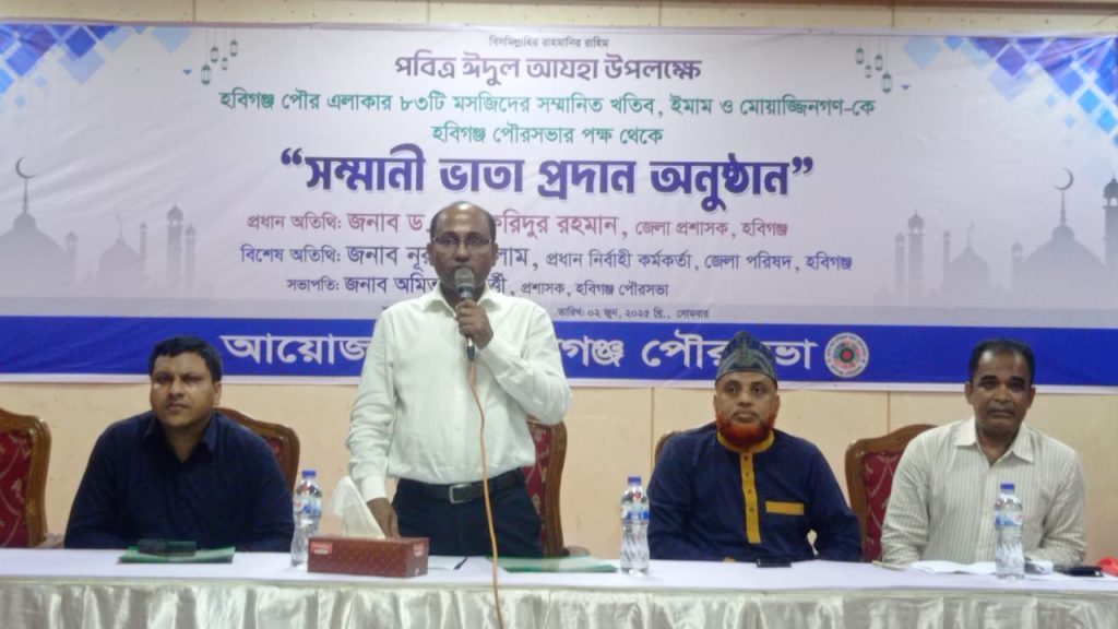 আলোচনা শেষে হবিগঞ্জ পৌর এলাকার ৮২ টি মসজিদের খতিব, ইমাম ও মুয়াজ্জিনদের পবিত্র ঈদ উল আযহা উপলক্ষে পৌরসভার পক্ষ হতে সম্মানী ভাতা দেয়া হয়। খতিব ও ইমামগন সম্মানী ভাতা হিসেবে ৪ হাজার টাকা করে এবং মুয়াজ্জিনগন ৩ হাজার টাকা করে গ্রহন করেন।#