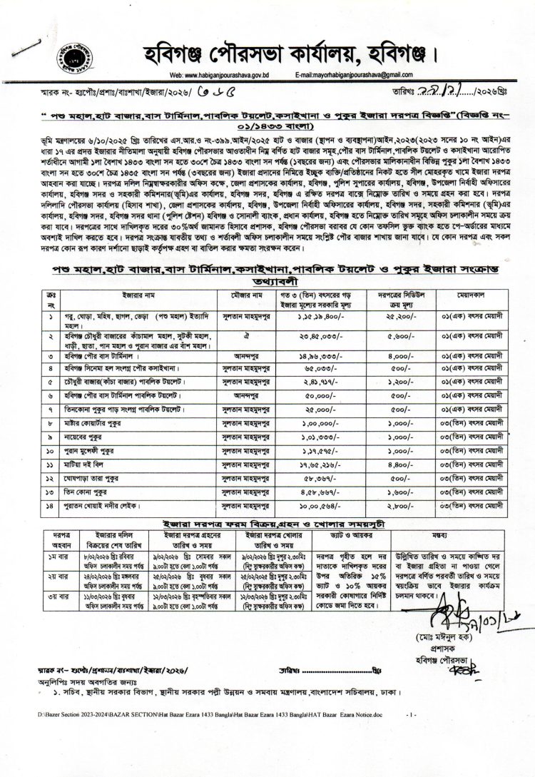 Posted in দরপত্র/নিয়োগ বিজ্ঞপ্তি, নোটিশ বোর্ড, সংবাদ বিজ্ঞপ্তি, সাম্প্রতিক কার্যক্রম, স্লাইড পশু মহাল, হাট বাজার, বাস টারমিনাল, পাবলিক টয়লেট, কসাইখানা ও পুকুর ইজারা দরপত্র বিজ্ঞপ্তি imadmin January 27, 2026 Leave a Comment on পশু মহাল, হাট বাজার, বাস টারমিনাল, পাবলিক টয়লেট, কসাইখানা ও পুকুর ইজারা দরপত্র বিজ্ঞপ্তি Author: imadmin